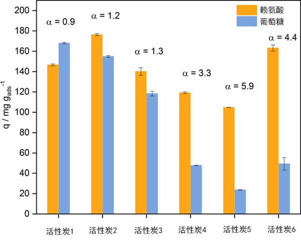 圖2:使用活性炭的競(jìng)爭(zhēng)性吸附實(shí)驗(yàn)中,賴氨酸和葡萄糖的吸附量。