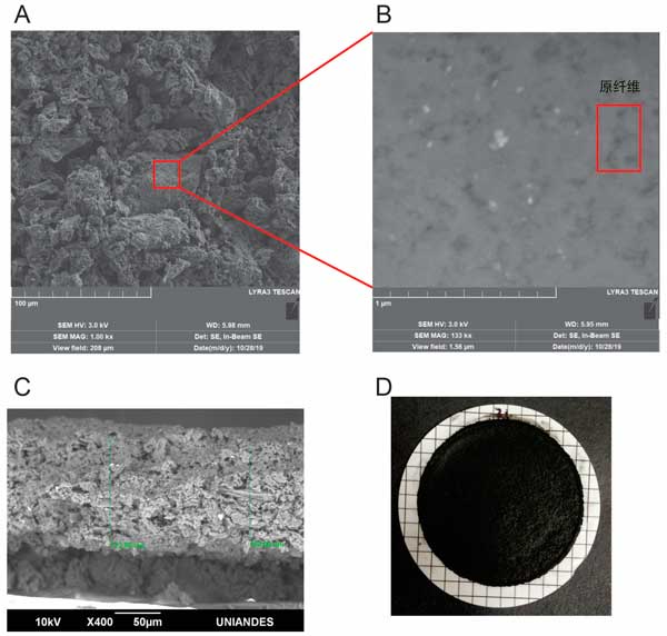 圖1:活性炭和原纖維混合膜的SEM形貌分析。(A)雜化納米膜表面的圖像,(B)雜化膜的SEM圖像的更高放大率(100×),以圓圈顯示淀粉樣原纖維粘附到活性炭上,(C)膜的橫截面的SEM圖像,(D)膜的外觀。