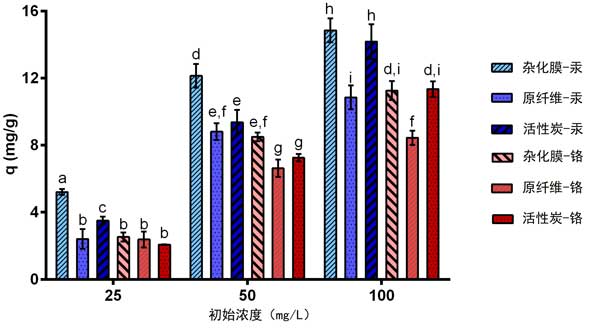 圖2:活性炭制備的雜化膜對汞(藍(lán)色條)和鉻(紅色條)的吸附能力。誤差線為標(biāo)準(zhǔn)偏差(n=3)。條上的不同字母表示基于最小顯著性差異(LSD)測試,p水平=0.05時(shí)不同處理之間的顯著性差異。