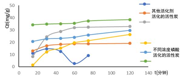 活性炭的吸附時間影響可從圖1看出,活性炭吸附分三步進(jìn)行:第一是在最初的30分鐘內(nèi),污染物的吸附量很快就被確定了,這可以用在吸附劑的外表面存在大量空置的結(jié)合位點(diǎn),這使得吸附劑易于吸附到該表面。第二在31分鐘后,吸附速率降低,過程緩慢;钚蕴康钠渌恢眠_(dá)到飽和后,污染物顆粒將遷移到吸附劑內(nèi)部。由于易于接近,因此吸附過程緩慢:顆粒內(nèi)擴(kuò)散。第三從80分鐘開始,我們觀察到一次接觸,活性炭已達(dá)到其最大容量。我們可以說這些吸附劑的平衡時間是80分鐘。然而,磷酸活化的活性炭吸附量的演化曲線顯示,在最初的30分鐘內(nèi),污染物的吸附量顯著增加,此后,污染物的吸附量急劇下降,這將是一種產(chǎn)物解吸。這一現(xiàn)象在其他吸附劑中是不可見的,這可能意味著可用孔隙的數(shù)量和結(jié)合力隨著所用活化劑濃度的增加而增加,這一點(diǎn)還通過碘值和亞甲基藍(lán)的值進(jìn)行了驗(yàn)證。