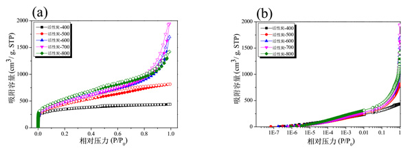 圖1:活性炭的等溫線吸附-解吸曲線隨各種磷酸活化溫度的變化(a)正常和(b)對(duì)數(shù)。