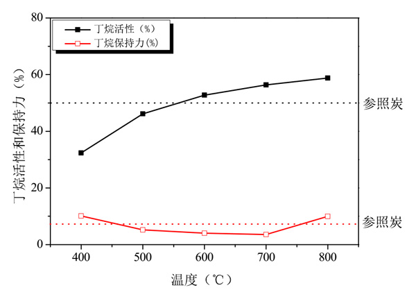 此外,代表活性炭丁烷吸附和解吸行為的丁烷工作容量隨著活化溫度的升高,在700攝氏度時(shí)升高至22.2–52.8%,然后在800攝氏度時(shí)降低至48.8%。丁烷工作容量是反映兩種丁烷的指數(shù)活動(dòng)和保持力。因此,活性炭-700被認(rèn)為具有很好的丁烷工作容量性能,因?yàn)樗哂谐錾亩⊥榛钚院妥畹偷亩⊥楸3至。另一方面,盡管活性炭-800具有出色的丁烷活性,但與活性炭-700相比,丁烷的保持力高,因此被認(rèn)為具有與活性炭-600相似的丁烷工作容量性能。