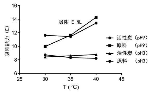 圖1:活性炭和原料在不同pH值下的吸附能。