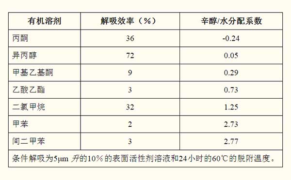 七種有機(jī)溶劑解吸效率表示與圖1。實(shí)驗(yàn)條件5米升的10%的表面活性劑溶液和60℃24個(gè)小時(shí)解吸溫度。的有機(jī)溶劑的解吸效率是3%,72%,9%,3%,32%,2%,而對(duì)于丙酮,異丙醇,甲基乙基酮,醋酸乙酯,二氯甲烷,甲苯,和3%的米二甲苯。